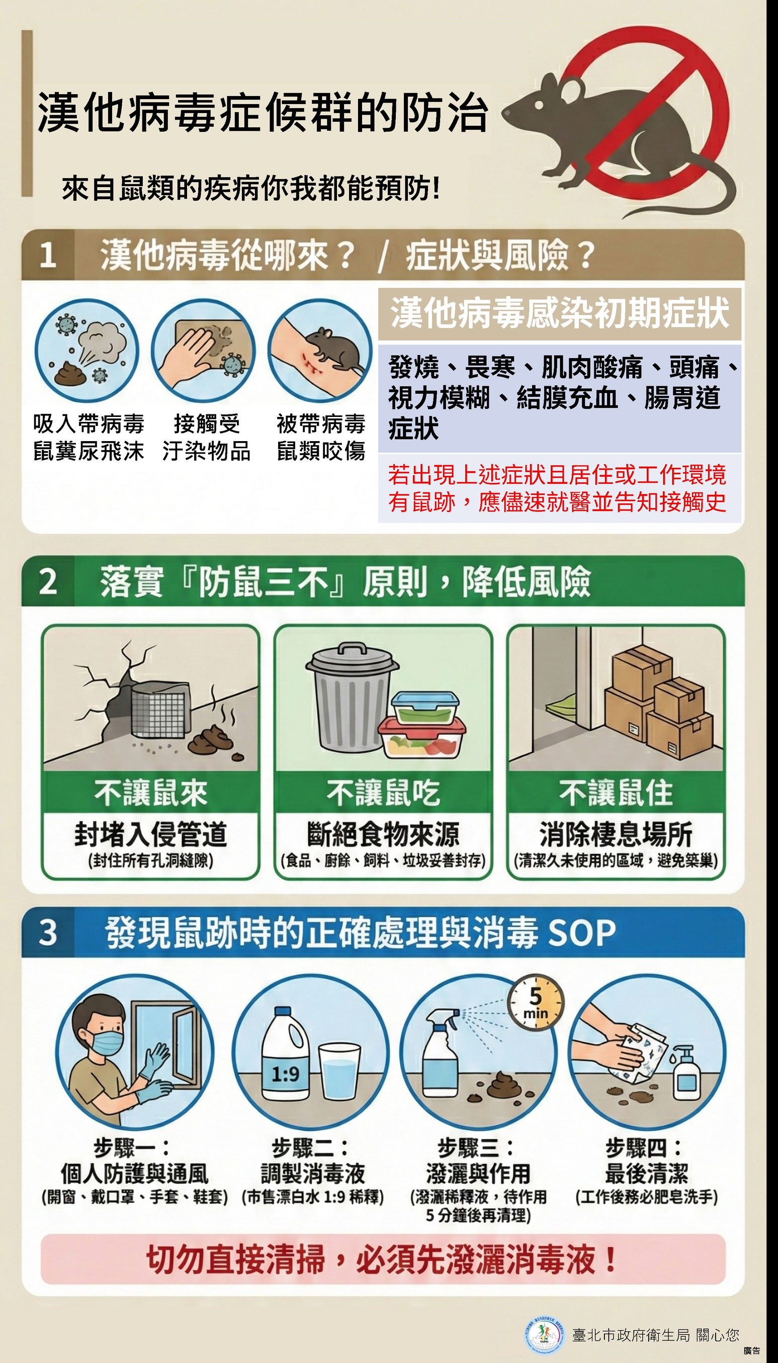 居家防鼠3不策略:「不讓鼠來-封閉鼠道、不讓鼠住-整理環境、不讓鼠吃-斷絕糧食」,清掃環境務必佩戴口罩,並使用塑膠或橡膠手套防護。若出現發燒、頭痛、暈眩、出血等症狀,應儘速就醫,並主動告知醫師相關動物接觸史。